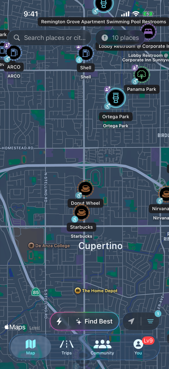 Our Hybrid AI Data Fusion Engine combines 5 data sources: 600+ brand profiles, user ratings, OpenStreetMap (2 million+ locations across 8 countries), Refuge Restrooms (LGBTQ+ safe and accessible spaces), and Apple Places. The AI scores restrooms, restaurants, rest stops, gas stations, and cafes with letter grades (A-F).