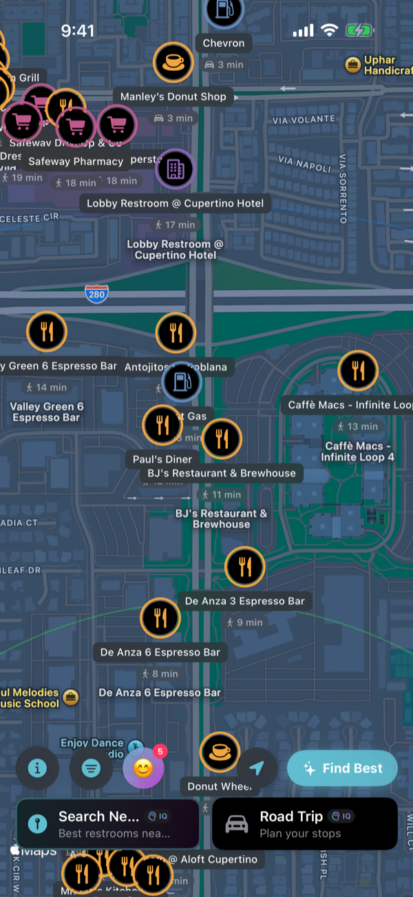 Our Hybrid AI Data Fusion Engine combines 5 data sources: 600+ brand profiles, community ratings, OpenStreetMap (50,000+ US toilets), Refuge Restrooms (LGBTQ+ safe and accessible spaces), and Apple Places. The AI fuses 400K+ POIs to predict quality with letter grades (A-F).